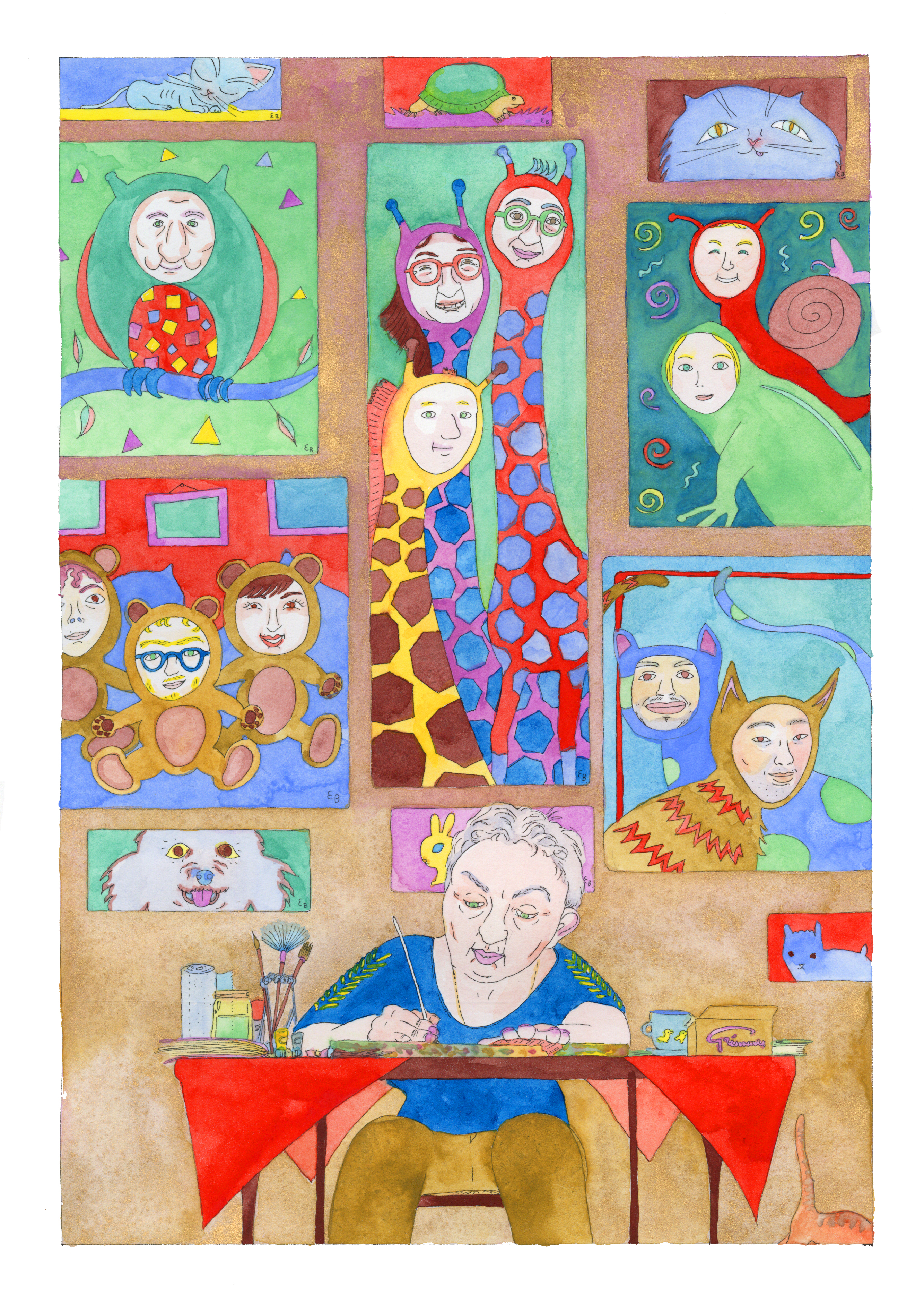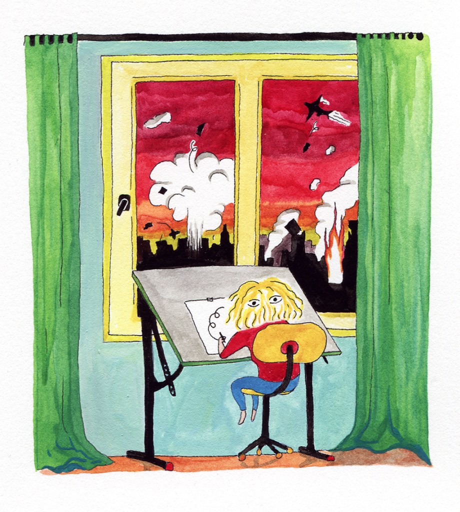 Artist at work II, pen and watercolor, 26x36cm, 2021
